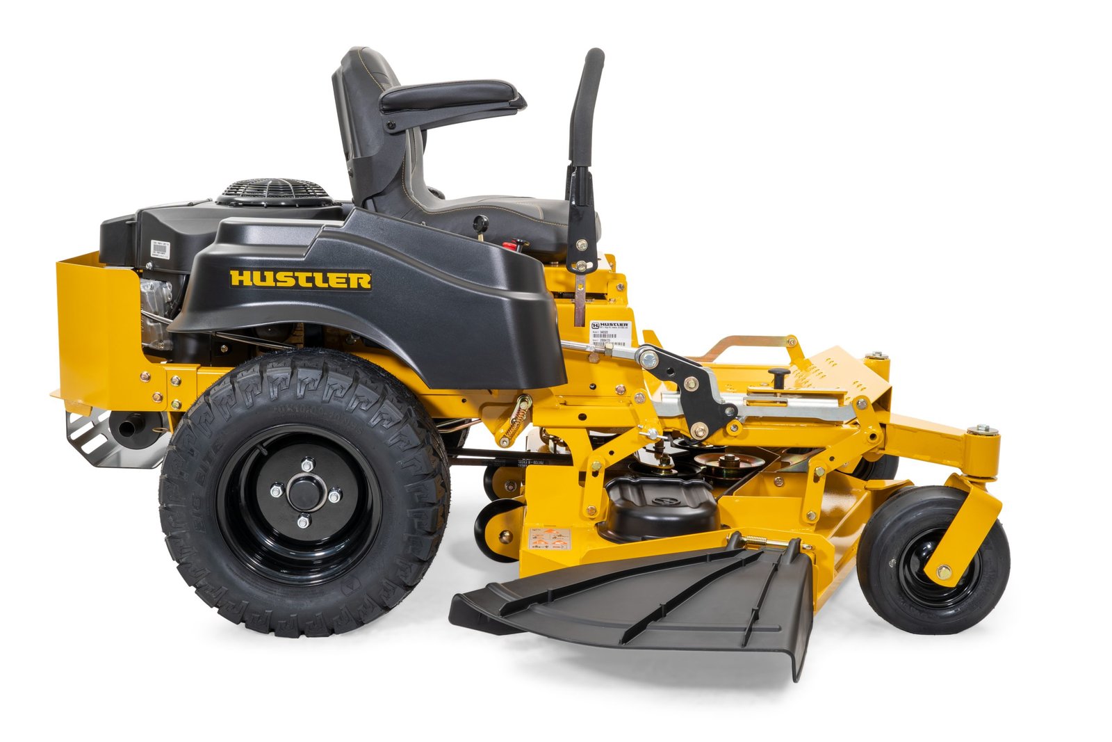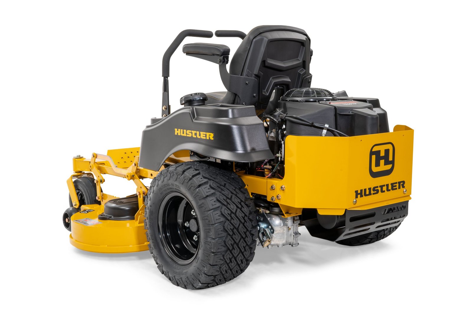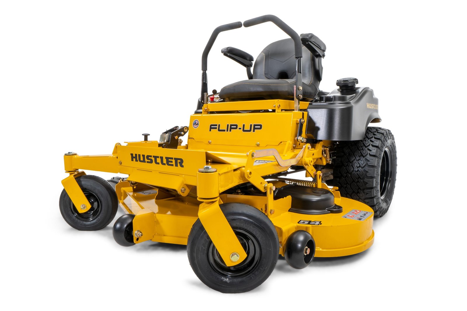 Hustler Raptor Flip Up 48" Rear Discharge 2-year / 200 hour residential warranty The Hustler Flip-Up features patent pending QuickFlip™ technology. Enjoy effortless cleaning and blade changing, automated deck height adjustment and less required storage space…all at the push of a button. Its so simple, there are no covers, springs, chains or belts to remove, Just unlock the chassis and push the button. The Hustler Flip-Up does the rest.