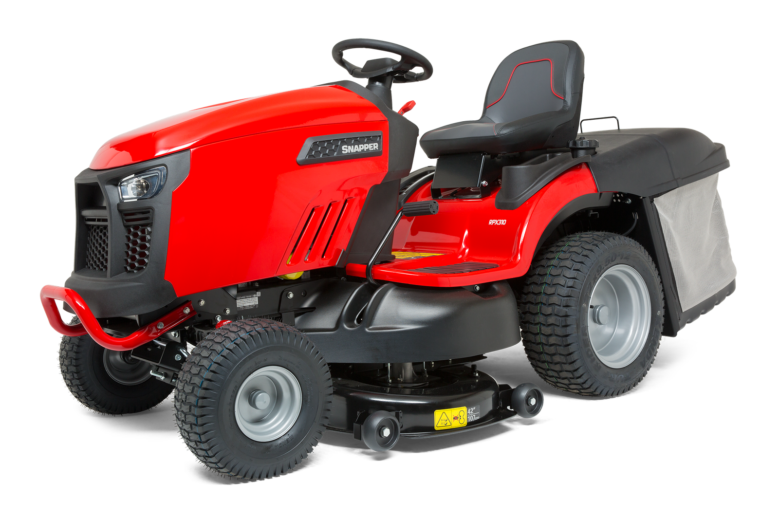 The Snapper RPX 310 rear collect lawn Tractor has a 42"/ 107cm twin-bladed pressed steel cutting deck and large 350-litre collector, which features a large comfortable lever enabling the user to empty the grass without leaving the seat.