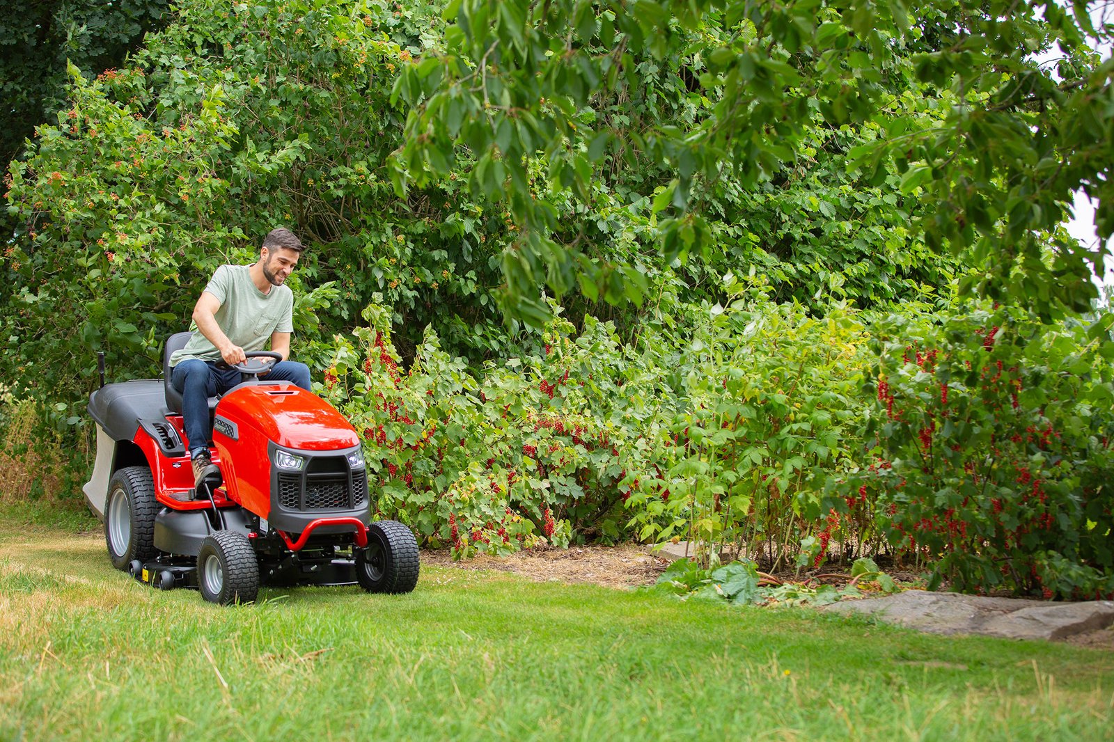 Manoeuvrability is enhanced thanks to the tight 36cm turning circle, whilst a pivoting cast-iron front axle and large 22" rear wheels allow a smoother ride over rough terrain. The solid steel front bumper bar adds durability