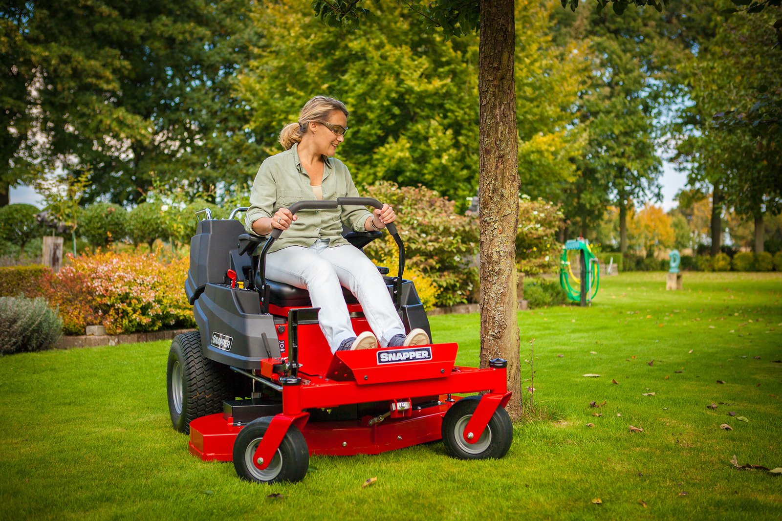With a rear discharge cutting deck, equal and closer cuts are able to be made whichever way around an obstacle is approached. The unwanted spreading of grass onto footpaths and flower beds is further prevented. Snappers