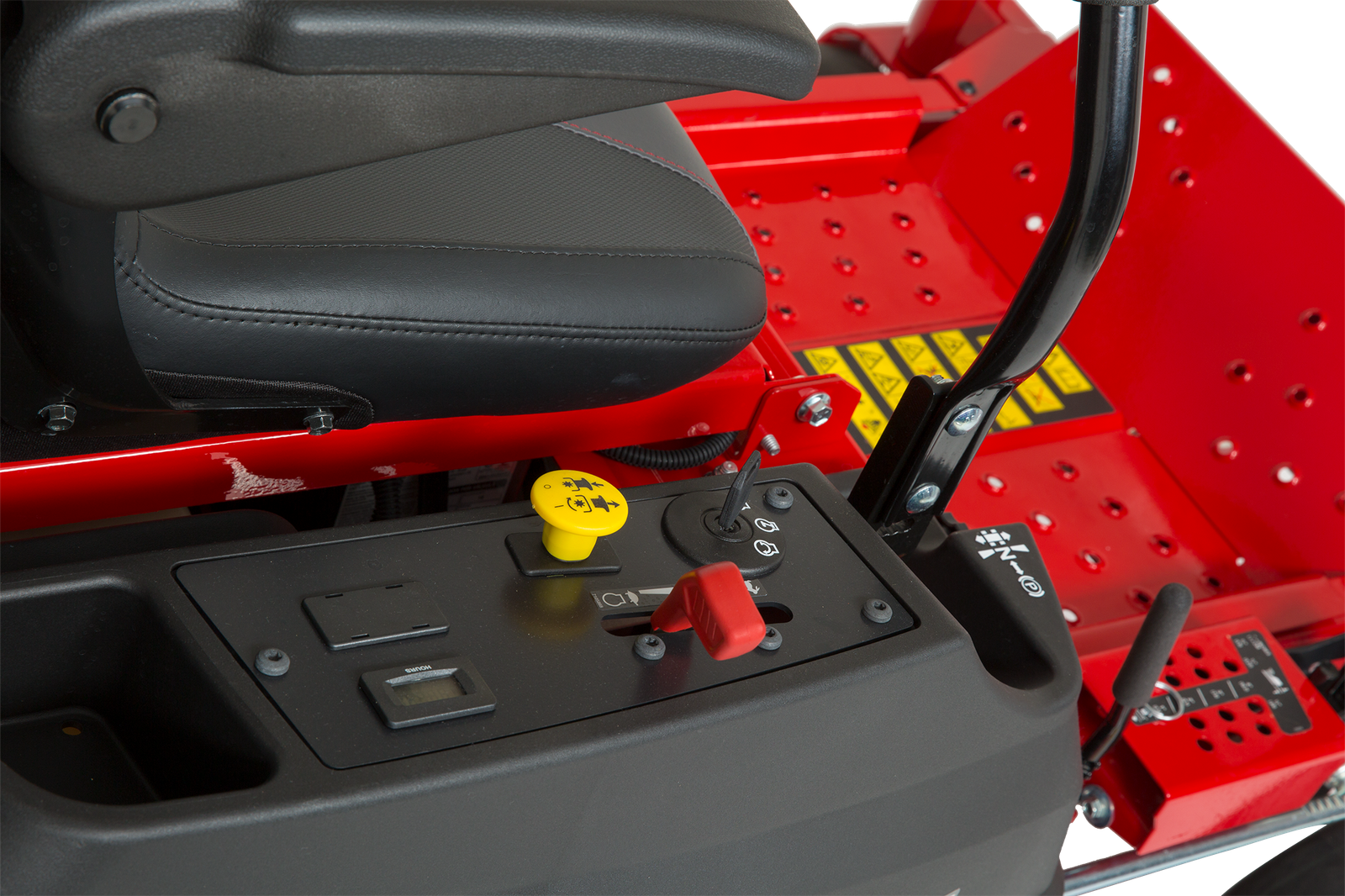 The heavy-duty rear-discharge cutting deck enables the operator to cut quickly and efficiently. The foot-operated mower deck lift and uncomplicated single pin design allow 13 heights of cut to be made, ranging from 38mm-110mm. Electric engagement of the triple-bladed cutting deck is easily made by the ergonomically placed, panel-mounted control. Deck wheels provide additional support and help reduced scalping, whilst the addition of a wash port makes underside cleaning simple.